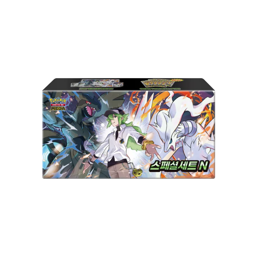 Le Coffret spécial set MEGA N coréen contient dix boosters Pokémon MEGA Dream ex en édition coréenne officielle. Il inclut également un deck case exclusif à l’effigie de N, Reshiram et Zekrom, un set de protège-cartes exclusifs composé de soixante-quatre sleeves, ainsi qu’un tapis de jeu officiel Pokémon Korea. Chaque élément a été conçu pour offrir une expérience complète, aussi bien pour le jeu que pour la collection.